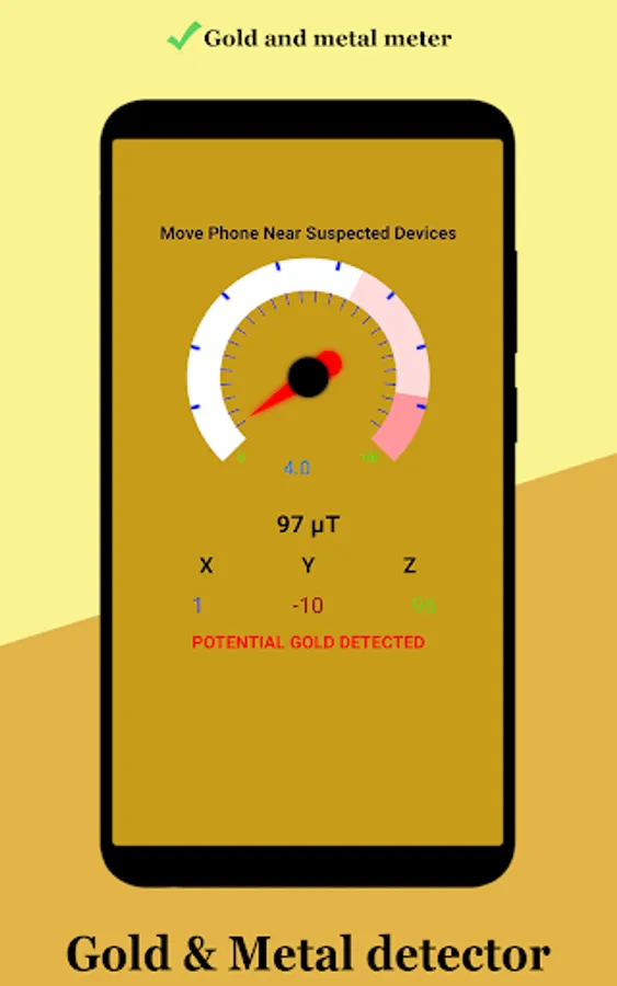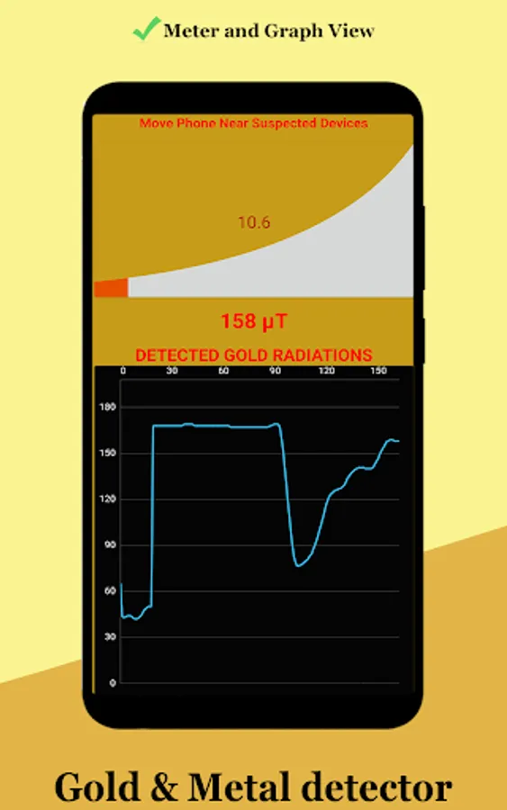 Gold detector free android app detection value varies with many object like hidden camera metal and emf devices so don't believe this to much but this will help to find many things like spy camera so you can also use it as hidden camera detector or spy camera detector. our gold simulator app is detect any type of gold very quickly so don’t waste any more time and get our free detector app from google play. our detector app is not detecting only gold it can be used for other metal detection like silver rings etc, it can easily find out any type of metals nearby you.