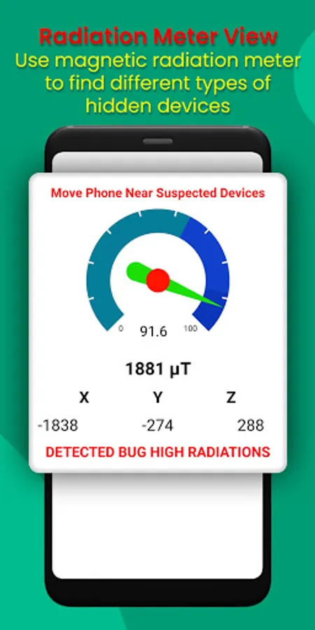 Hidden Devices Detector : Through Hidden Devices Detector, CCTV FINDER free android app users can search for hidden devices. Radiation Detector: In this method Radiations are very harmful to human health. As in this method the app uses magnetic sensor to detect radiations. (It works in all phones which have magnetic sensor).