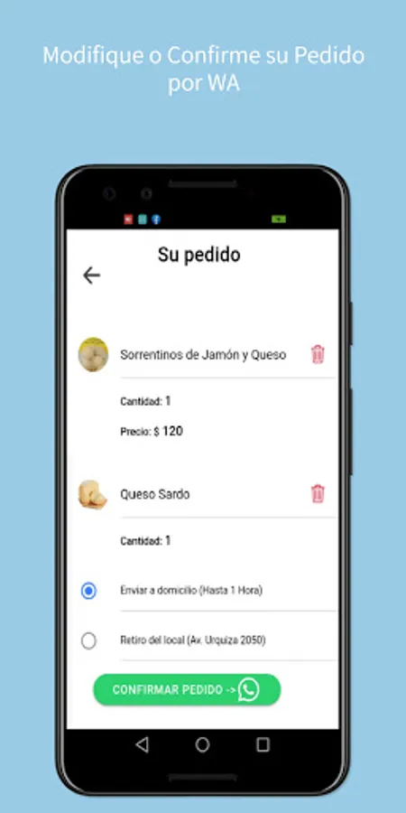 Through this app you can select foods, add them to the order cart, confirm the order via WA. Applies only in the city of Olavarría, Province of Bs As, Argentina.