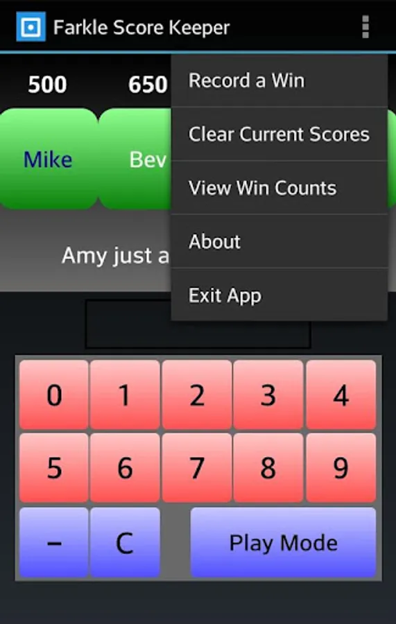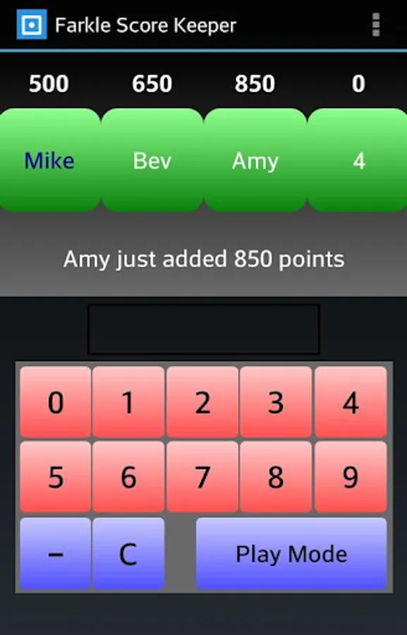 Makes Farkle score keeping a snap. Just punch in the points, click the player, and the score is updated. Signals when 10,000 is reached. Stores winners/dates. For tablet or phone. Is visible to multiple players on a tablet.
