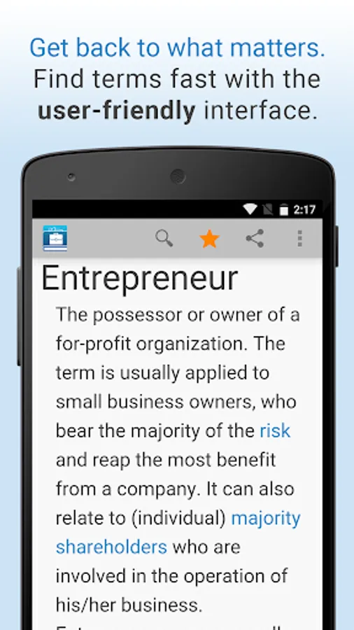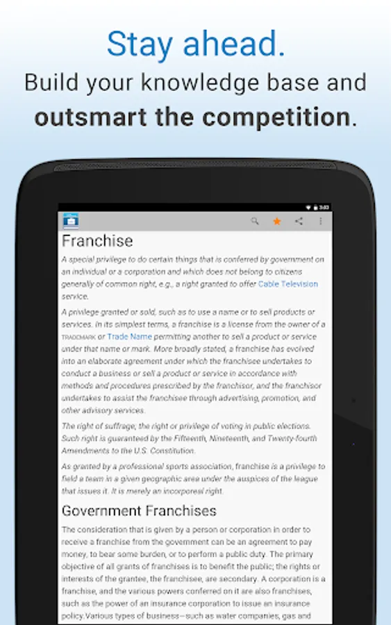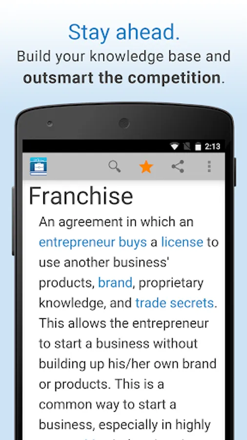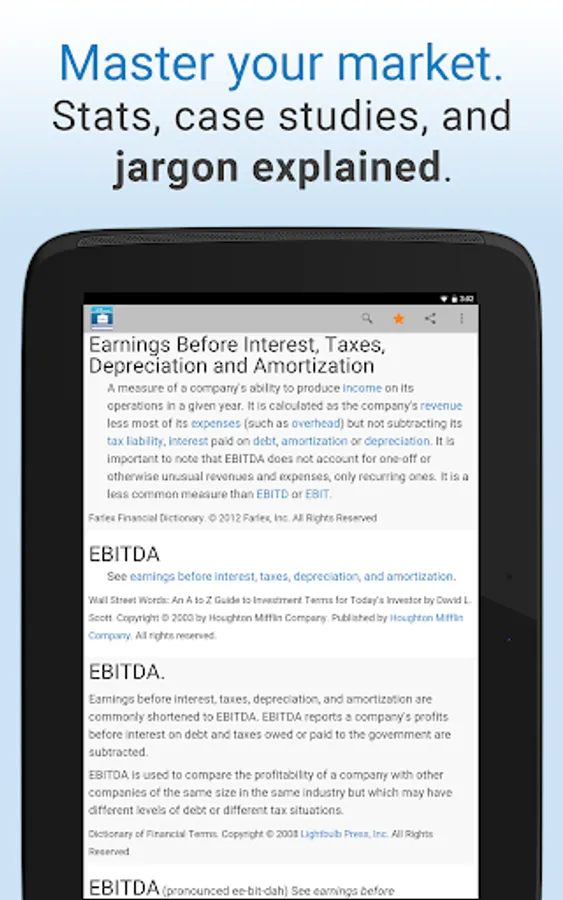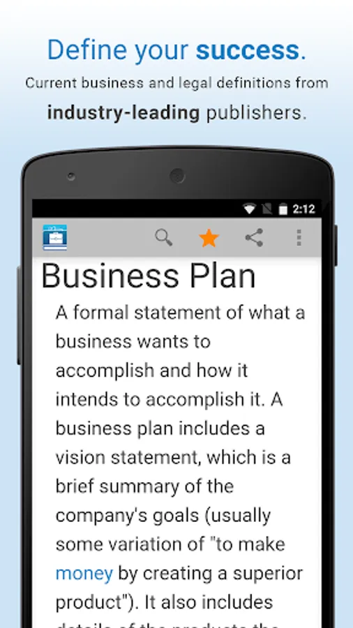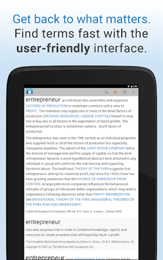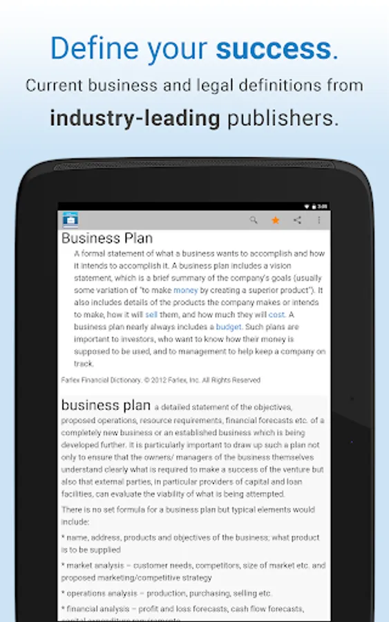 Business Dictionary by Farlex gives you free, instant access to 88,000+ current financial, legal, and business definitions from industry-leading publishers, all in one easy-to-use Android app. Plus an offline dictionary!