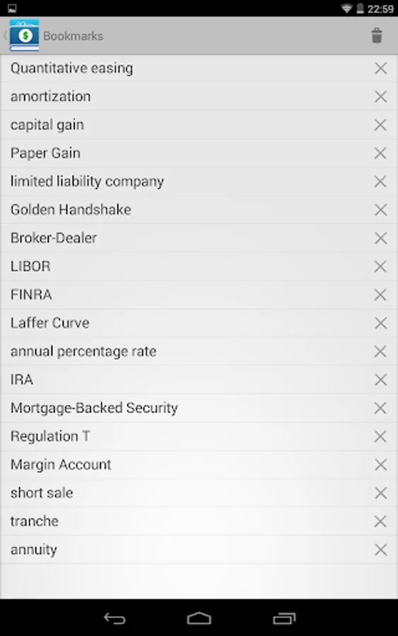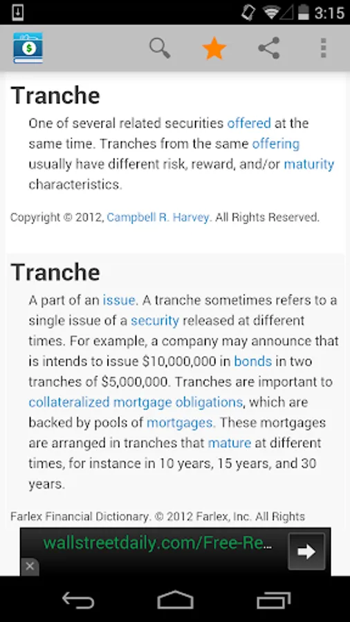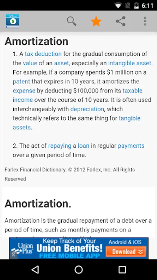 Financial Dictionary by Farlex gives you free, instant access to more than 26,000 financial and business definitions related to investing, financial analysis, banking, taxes, insurance, international business, and more. Plus offline content: nearly 20,000 entries available without an Internet connection.