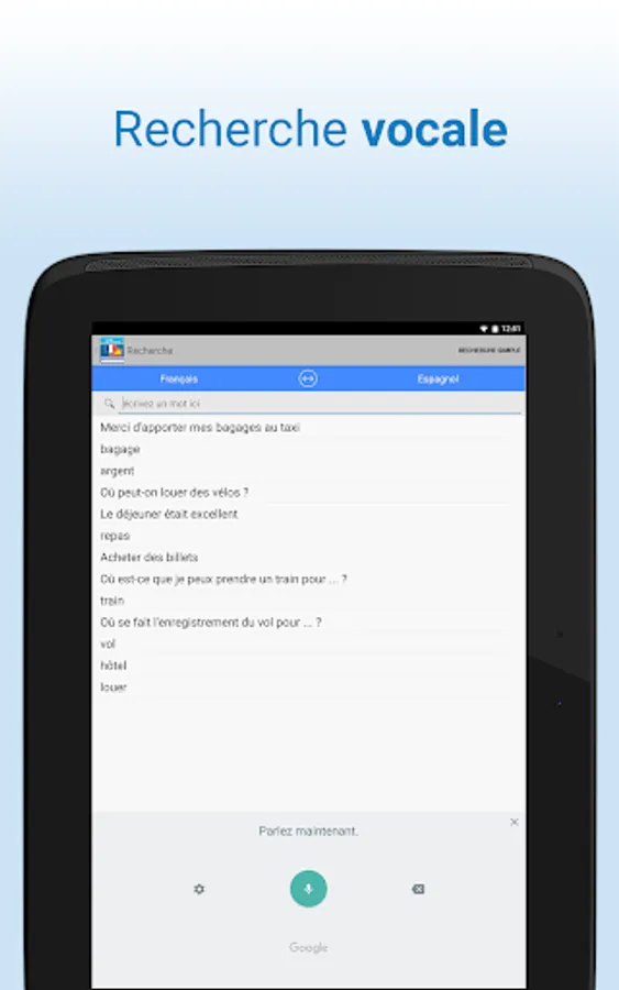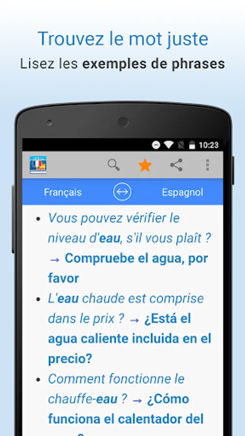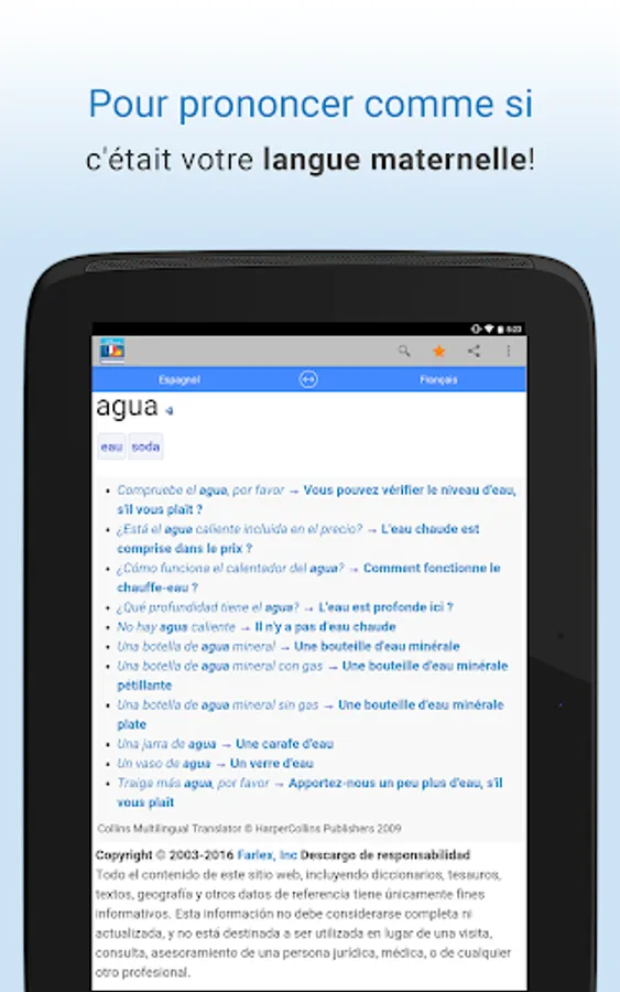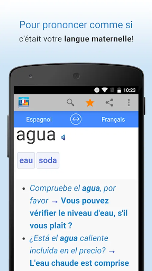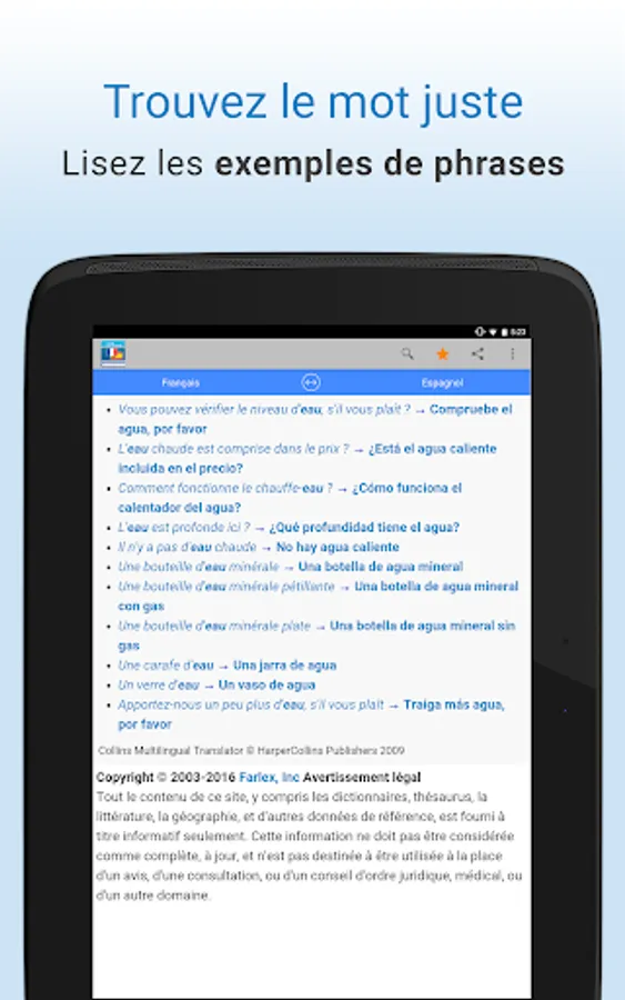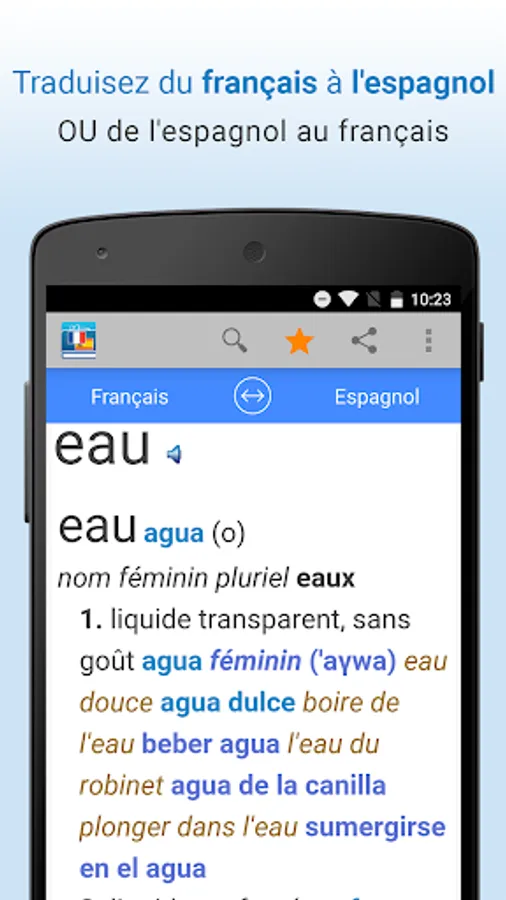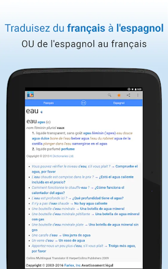 Translate words and common expressions from French to Spanish OR Spanish to French! The bilingual French-Spanish dictionary Farlex instantly provides translations with voice search or text, more access to audio pronunciations, definitions, sample sentences and much more!