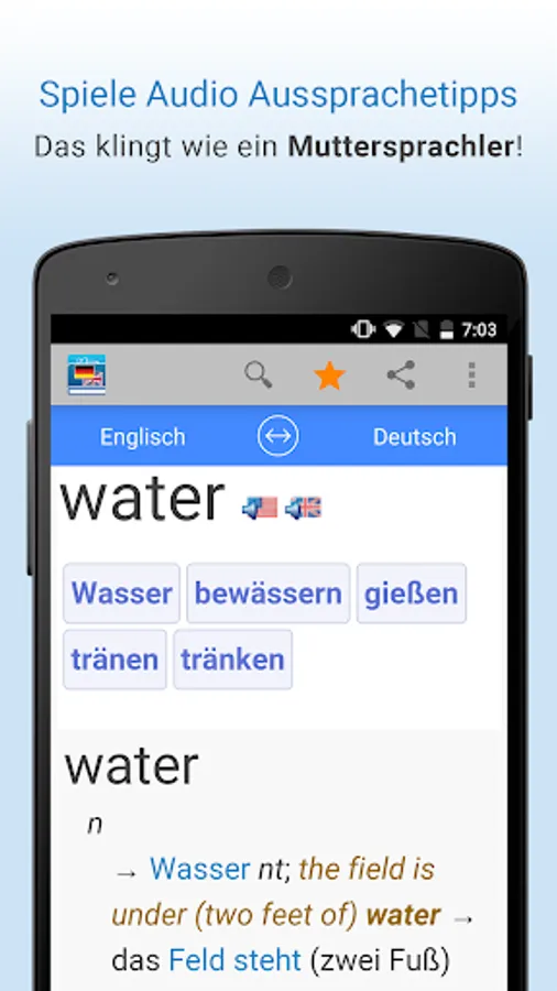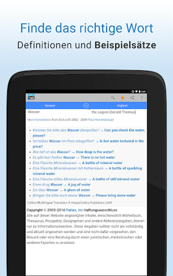 Übersetze Wörter und gängige Phrasen vom Deutschen ins Englische ODER umgekehrt! Das Deutsch-Englische Wörterbuch von Farlex ermöglicht eine direkte Übersetzung von Sprach- oder Textsuchen mit Audio Aussprachetipps, Definitionen, Beispielsätzen und mehr!