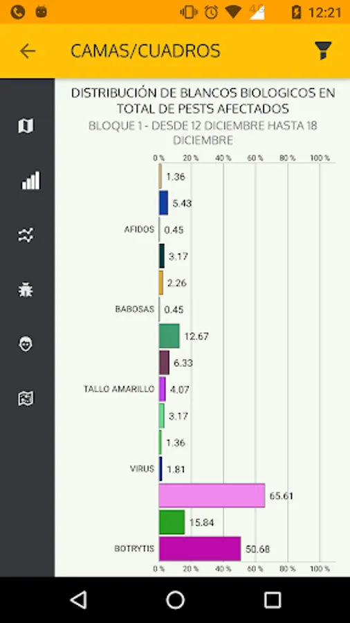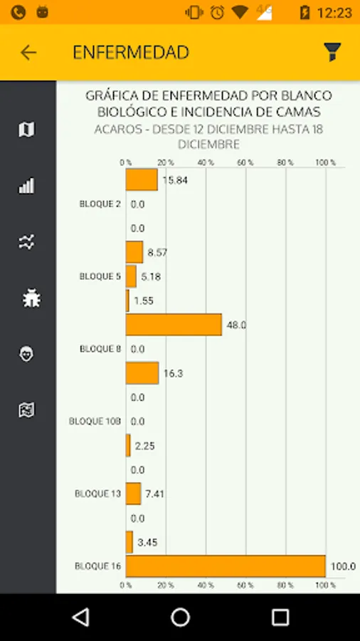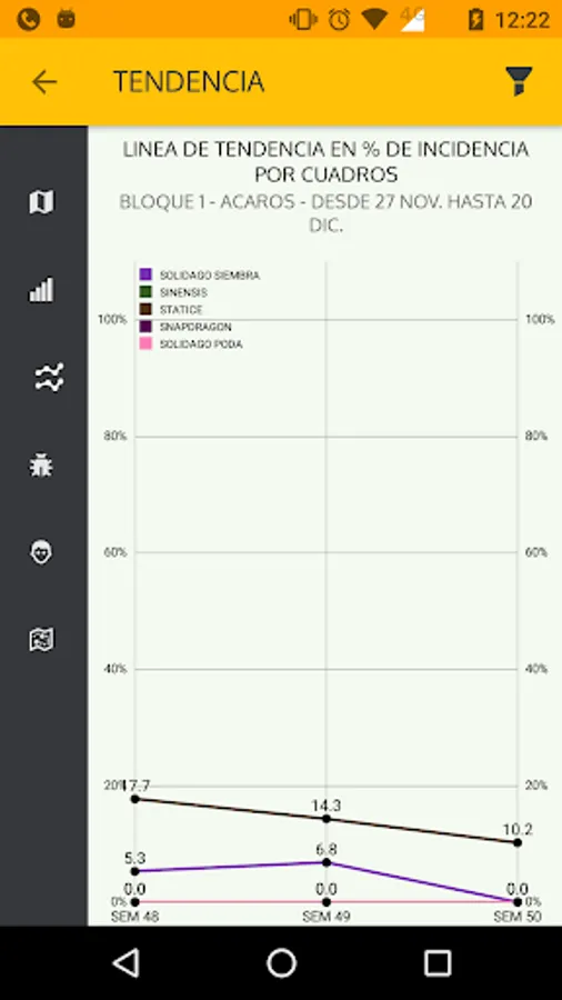 FARMAPP ANALYTCS is a module designed to track and analyse all the data collected in the farm. Follow in detail the pest's location via satellite view, trend charts and summary percentage graphs. All the important decision-making information on your hands.