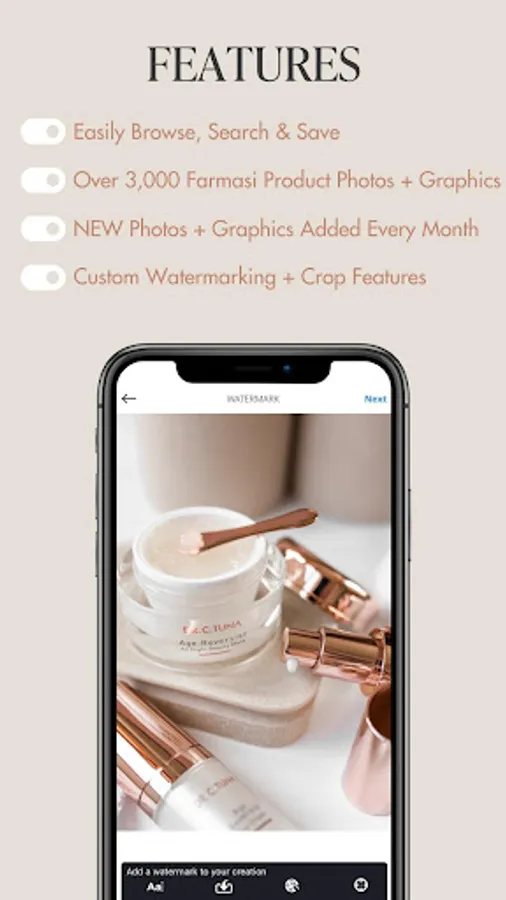 We are a third party photographic partner to Farmasi. Farmasi corporate sends our team product(s) and we photograph, edit the photos with care and add photos to the app for Beauty Influencers to use in their businesses! NOW, over *350 FREE photos within the Free App and over *3,000 photos within the Pro App and growing.