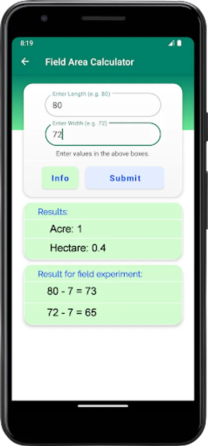 Get calculations according to the estimated area of the field counted in the number of foot-step counts, side to side, along the field boundary; to get result in Acre and Hectare.