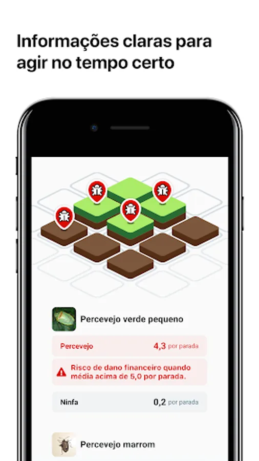 Based on their agronomic profile, we have organized the main pest and disease control strategies in your area. You enjoy your farm inputs and tell us what you have found simply and quickly. We alert you to the issues that really matter so that you take the right control actions.