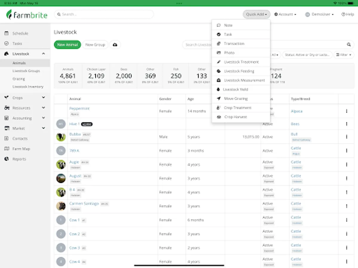 Farmbrite is a complete farm and livestock record keeping & management system designed to help you run a more efficient, productive, and profitable agricultural business. With Farmbrite you'll find all the features you need to be better organized, keep better records, manage your resources, track production, identify trends, gain valuable insights, and increase efficiency and profits.