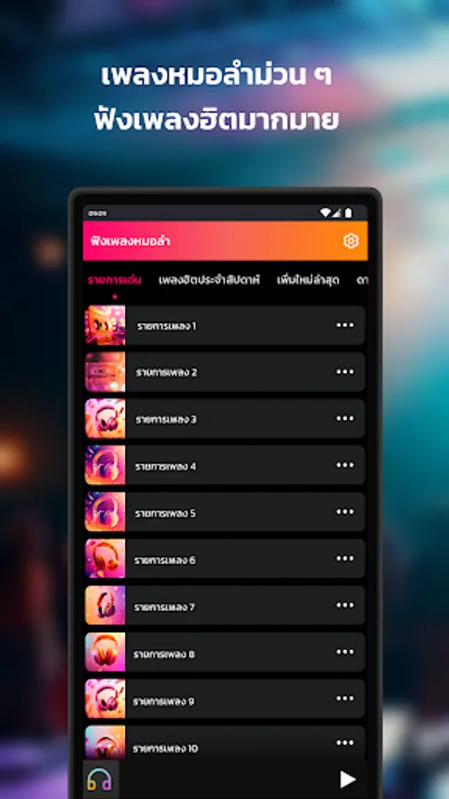 Listen to Mor Lam songs is an application that allows you to listen to Mor Lam songs. Enjoy fun music. Listen to country music In which we have collected many popular songs, Isaan country music that is charming and unique to the Northeast region. Join in the fun with many Mor Lam songs. that we want you to try listening to Whether it is traditional Mor Lam songs or modern Mor Lam songs. Definitely won't let you down. Our application is easy to use, no registration required. There is no charge. All you need is an internet connection. We will send you a list of Mo Lam songs. Definitely sent directly to you. Listen to country music without using the internet easily. Just choose to listen to country music online. Then choose to download and listen to it later. Make you able to Listen to country music Can be carried anywhere Enjoy listening to Isaan music. Feel free to try out the application. "Listen to the Mor Lam song". Let's have fun together today.