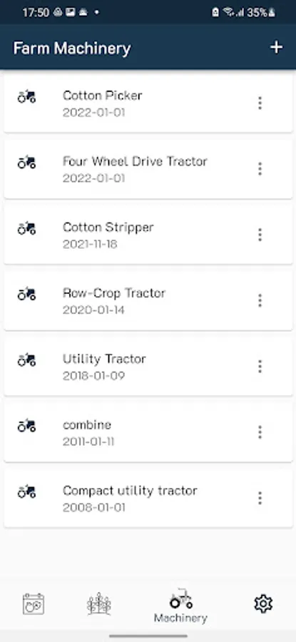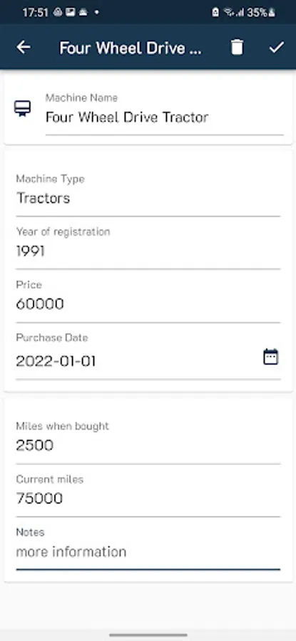 You can add farm machinery and record information like machine name, machine type (trucks, tractors, harvesters), price of the machinery, purchase date, miles when bought, current miles (we will provide feature to record monthly or daily miles soon) and any additional notes.