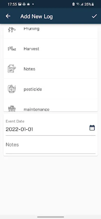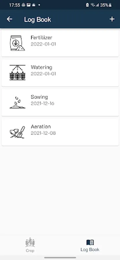 Once the crop is added click again on the crop and choose the log book from the bottom navigation bar. You can log following events for your crops