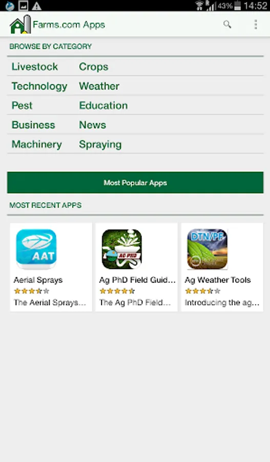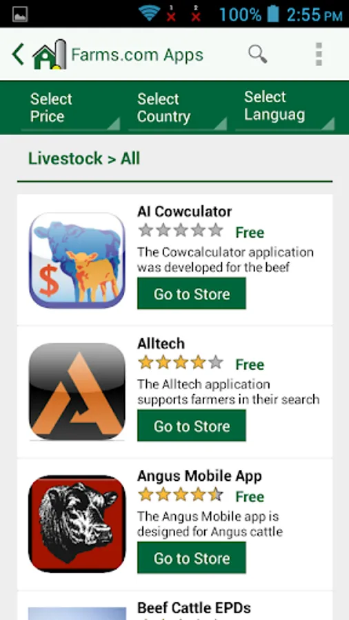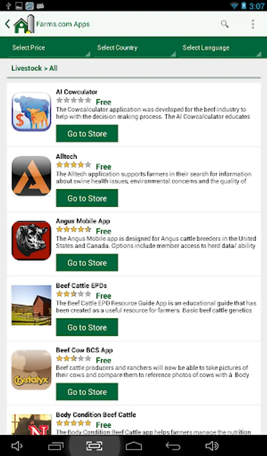 Find hundreds of specialized agriculture apps, including livestock apps, horses, cattle apps, swine, dairy apps, poultry, crops, commodities apps, hay and forage, pest control, canola, soybeans, cotton, corn, and more. With Farms.com Agriculture Apps you can browse farming and agriculture apps by category, popularity and recently added, or search for apps by price, country, language, and more. With app details and descriptions, Farms.com Agriculture Apps makes it easy to find the perfect mobile agriculture app for your special needs.