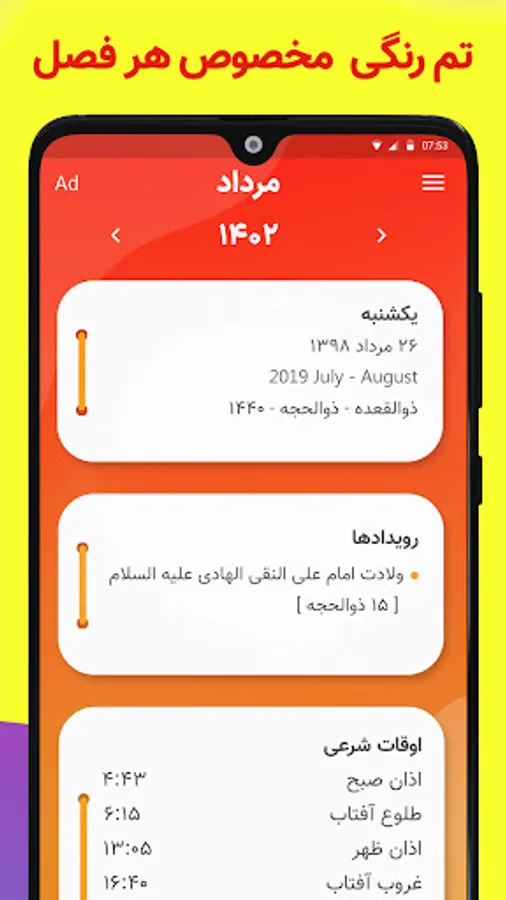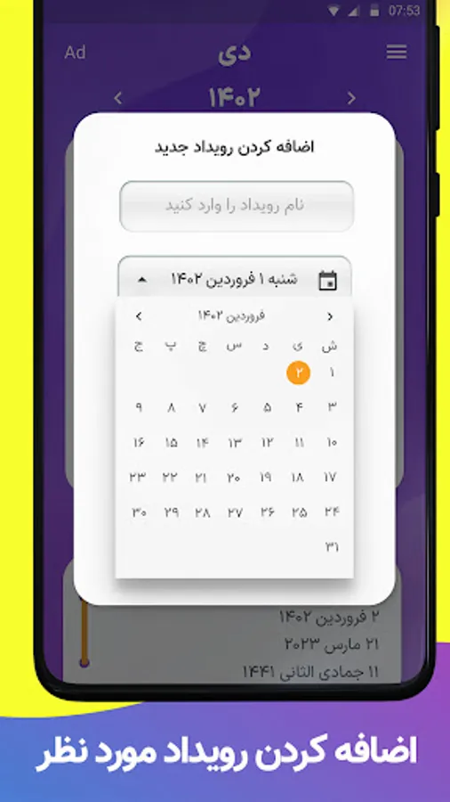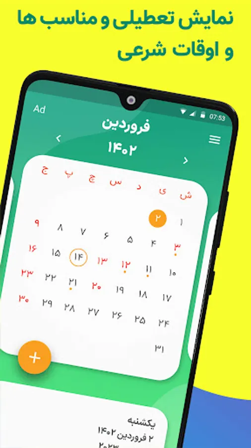 تقویم فارسی 1402 به همراه قبله نما و اذان گو، قطب نما، یادآور و رویدادها و تعطیلات رسمی 1402. همه در برنامه کاربردی تقویم شمسی 1402
