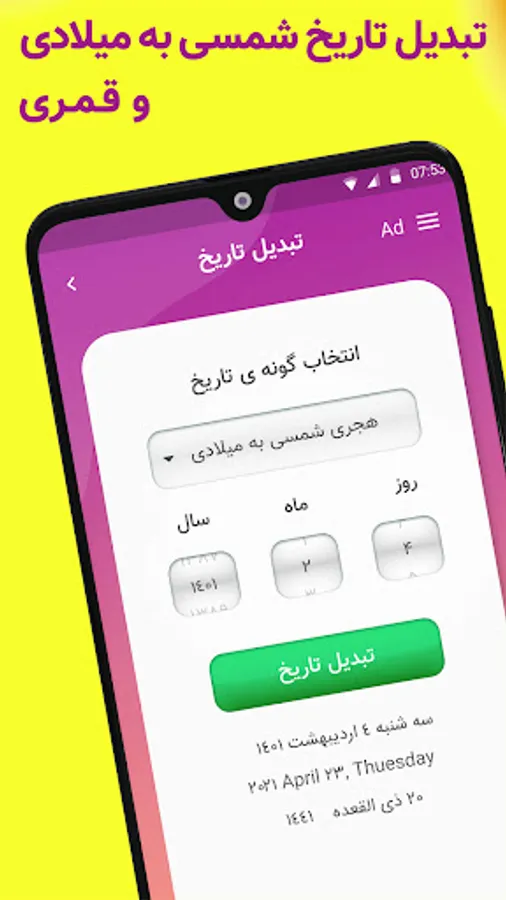 • امکان تبدیل تاریخ شمسی به میلادی و قمری