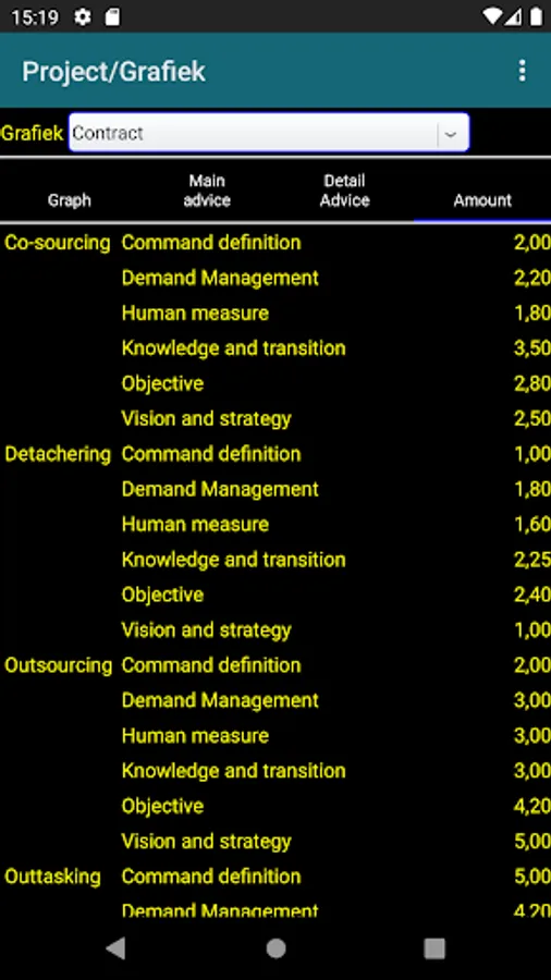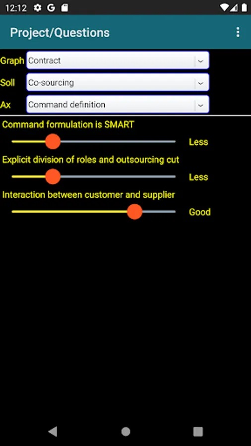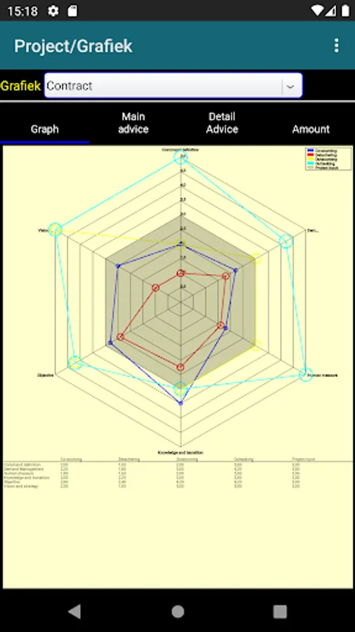 This app can register various questions and corresponding answer valuation. This results is given in a web graph with advice. In the example it is used for offshore, nearshoring etc. But this app can be used for multiple purposes.