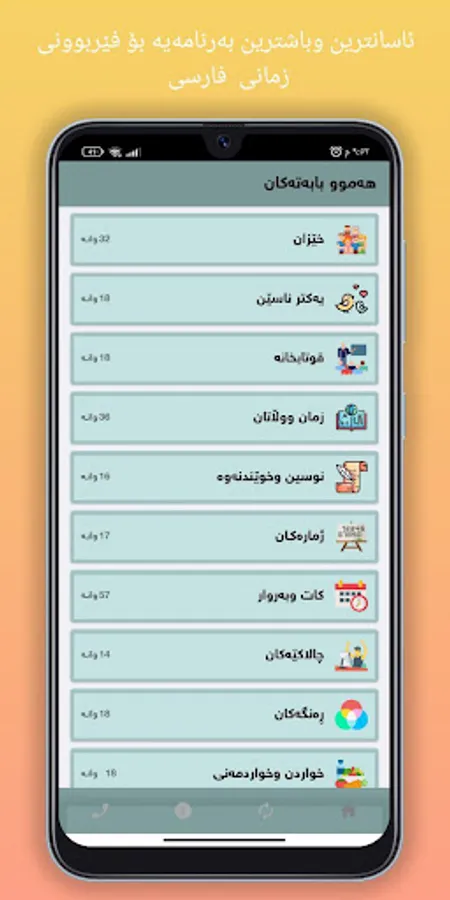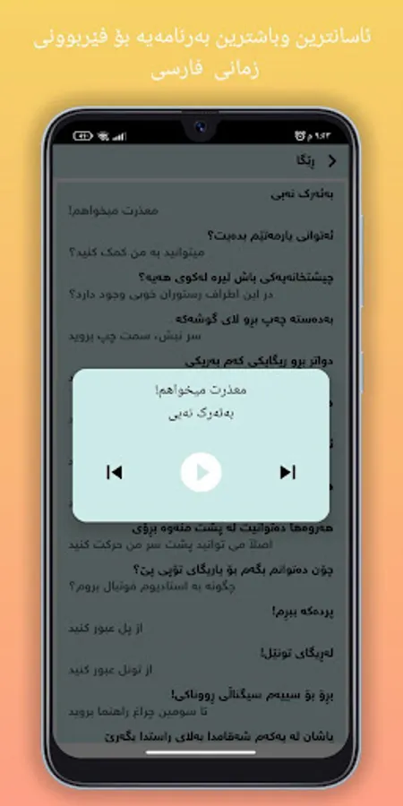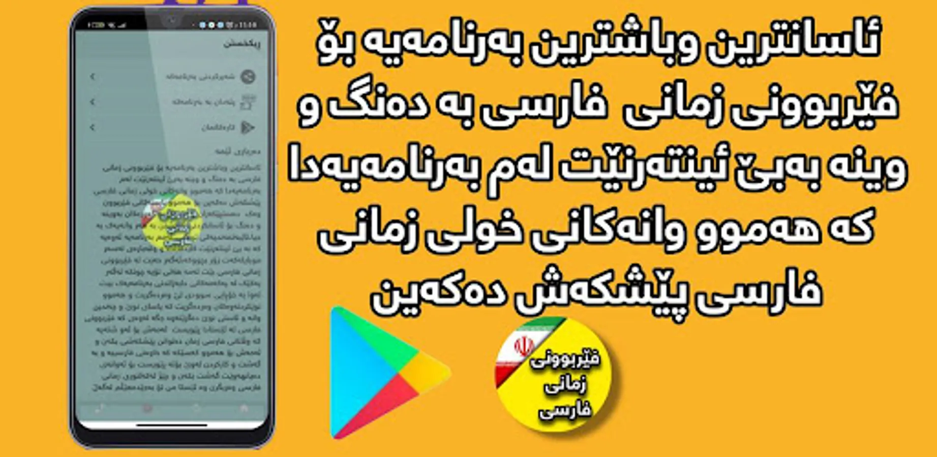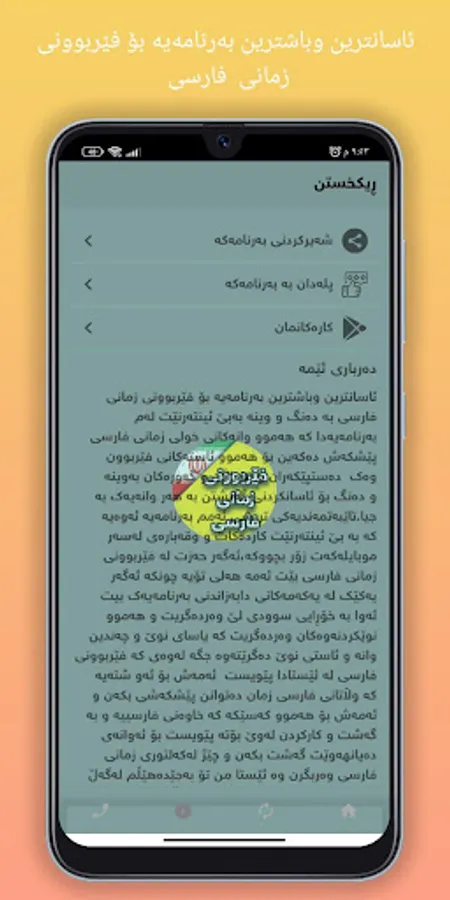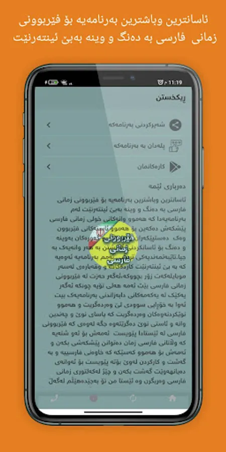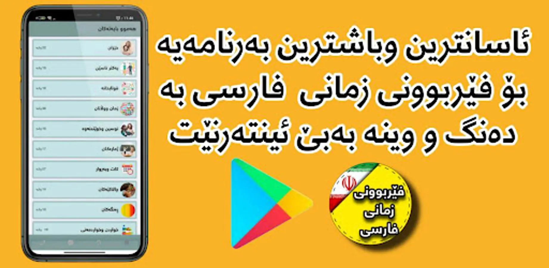 ئاسانترین وباشترین بەرنامەیە بۆ فێربوونی زمانی فارسی بە دەنگ و وینە بەبێ ئینتەرنێت لەم بەرنامەیەدا کە هەموو وانەکانی خولی زمانی فارسی پێشکەش دەکەین بۆ هەموو ئاستەکانی فێربوون وەک دەستپێکەران و منداڵان و گەورەکان بەوینە و دەنگ بۆ ئاسانکردنی گەیشتن بە هەر وانەیەک بە جیا.تاێبەتمەندیەکی تریشی ئەمم بەرنامەیە ئەوەیە کە بە بێ ئینتەرنێت کاردەکات و وقەبارەی لەسەر موبایلەکەت زۆر بچووکە،ئەگەر حەزت لە فێربوونی زمانی فارسی بێت ئەمە هەلی تۆیە چونکە ئەگەر یەکێک لە یەکەمەکانی دابەزاندنی بەرنامەیەک بیت ئەوا بە خۆڕایی سوودی لێ وەردەگریت و هەموو نوێکردنەوەکان وەردەگریت کە یاسای نوێ و چەندین وانە و ئاستی نوێ دەگرێتەوە جگە لەوەی کە فێربوونی فارسی لە ئێستادا پێویست ئەمەش بۆ ئەو شتەیە کە وڵاتانی فارسی زمان دەتوانن پێشکەشی بکەن و ئەمەش بۆ هەموو کەسێکە کە خاوەنی فارسییە و بە گەشت و کارکردن لەوێ بۆتە پێویست بۆ ئەوانەی دەیانهەوێت گەشت بکەن و چێژ لەکەلتوری زمانی فارسی وەربگرن وە ئێستا من تۆ Bajd ە ێڵ ێڵ ێڵ ە ەڵ ەڵ ەڵ ەڵ ەڵ ەڵ ەڵ ەڵ ەڵ ەڵ ەڵ ڕ . • Wargani kurdish - farsi bێ entarnet, ka wa dakht beh khirayi tێbgait. • Pishandani Şeşta and Şakan in Persian and Kurdish. • Wankanani Dang Bۆ Fێrbouni Khondandawy Dorosti Zamani Farsi. • ڕstay anh and zr garng. • Persian Datuanit Fێrbyt lah haftiyakda and babێ mamۆasta • ڕawuni lah waێna wa dang • yasan bakkardێt. • Qabari Bchoukh. • Bakhۆڕayi and Bbێ Intarnet kar dhakat. •