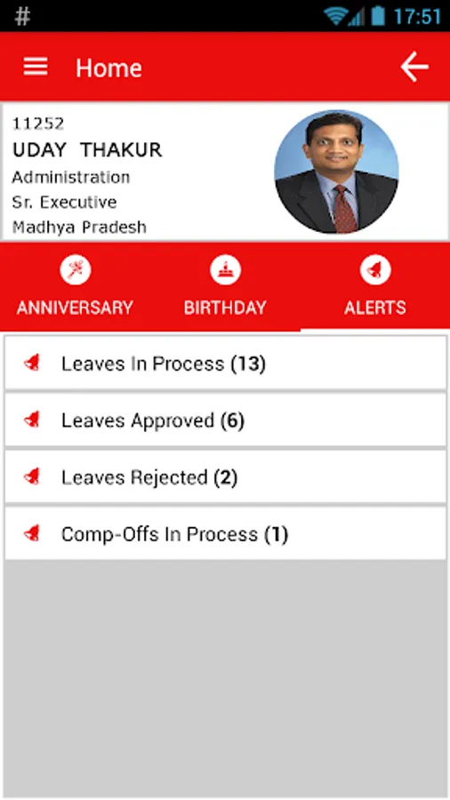 The Home page showcases Employee’s details like Employee-Id, Date of Birth, Date of Joining, Designation, Department etc. The Home page has widgets that help to set reminders, birthdays, alerts and departmental announcements.