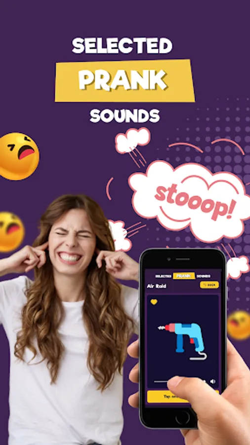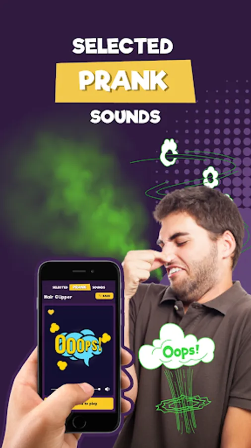 The app contains a selection of different Funny sounds. For convenience, they are all sorted into types, so that they can be quickly found and played on the phone to prank someone.
