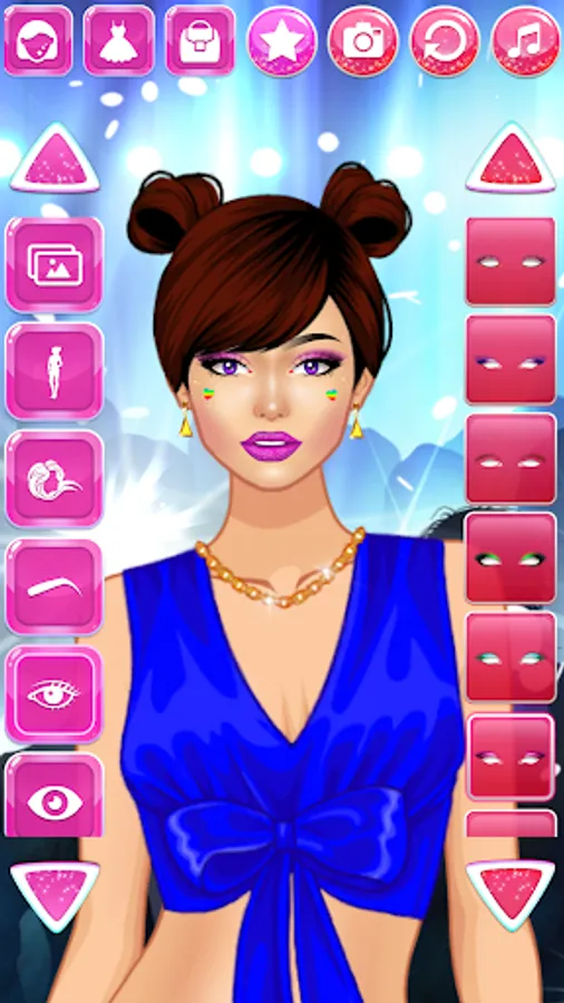 Choose outfits from hundreds of clothing items: stylish skirts, tops, dresses, jackets, outerwear and muslim clothes. Select chic bags, glasses and facial accessories such as face sparkles and piercing.