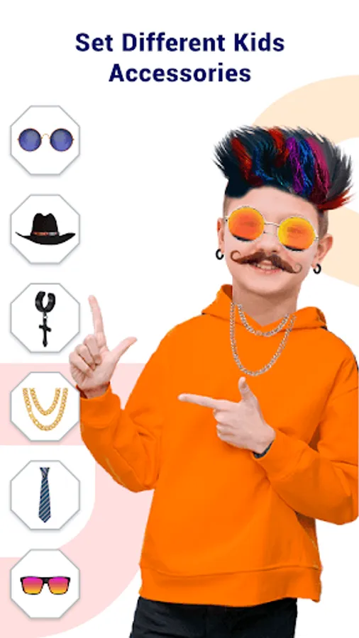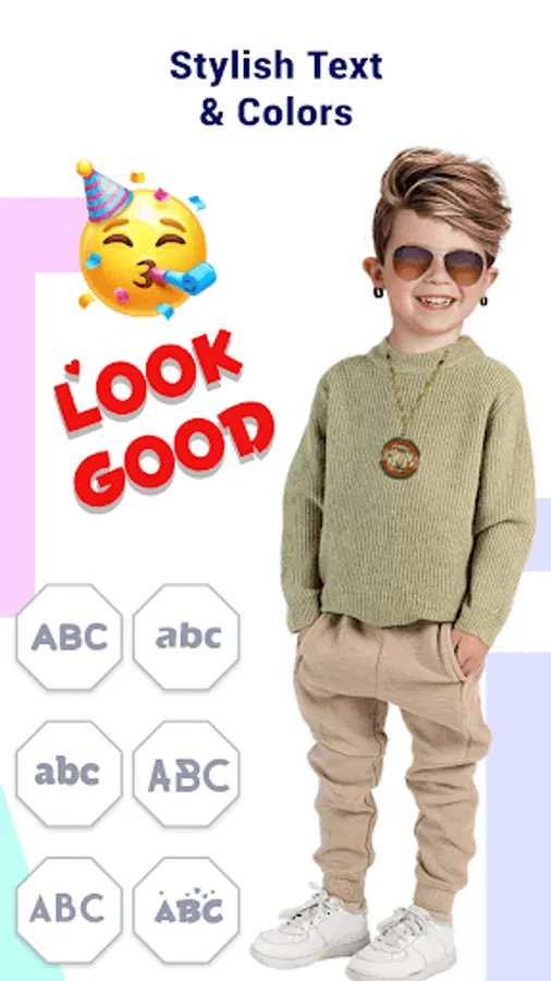 Kids Fashion Photo Editor also gives a collection of trendy fashionable chains, caps, ties, earrings, and goggles. To make the kid's fashion photo more attractive, you can add frames, stickers, and text to the photo.