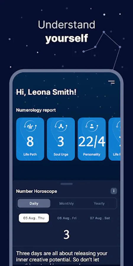 Reveals your Personal Day, Month, and Year numbers (full access on Premium). This is the perfect feature to help you plan ahead and prepare for any challenges you might face in the coming weeks and months.