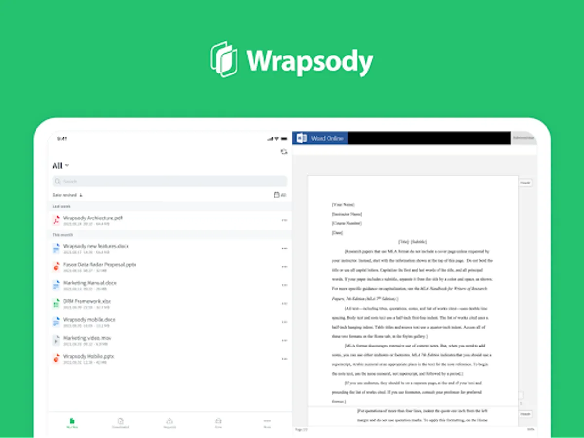 Wrapsody is an innovative data-centric content management and collaboration tool that organizes and tracks content changes to shared use files. With Wrapsody mobile, users can access up-to-date content at any time in any place using mobile devices.