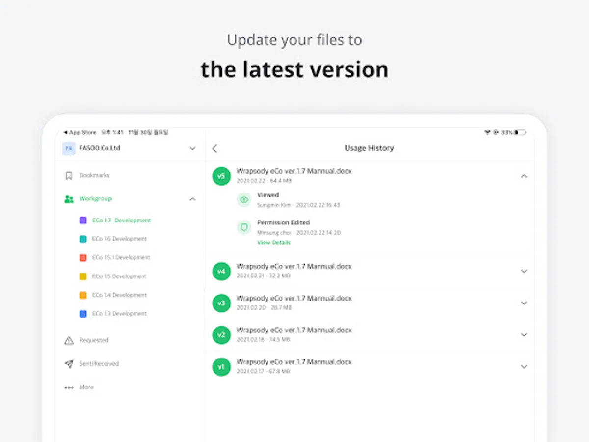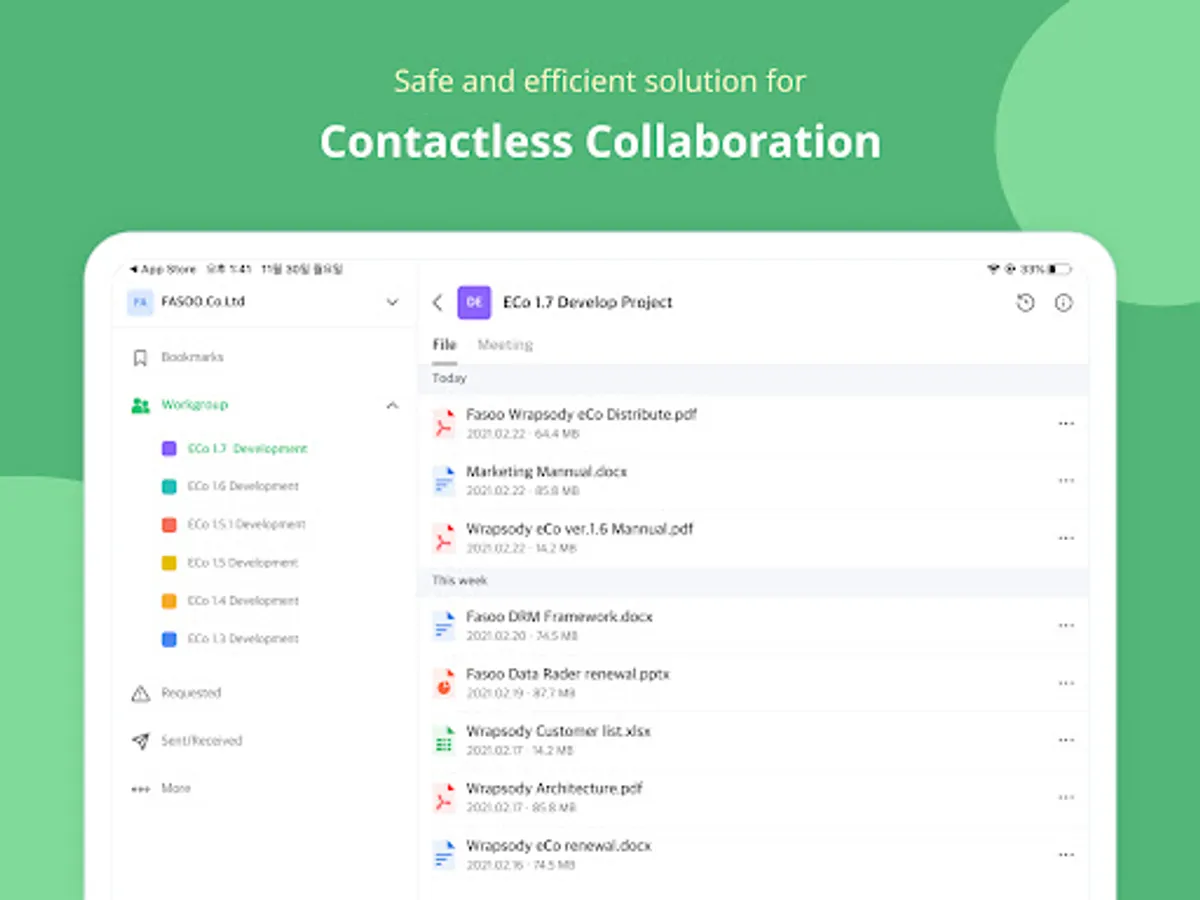 Wrapsody eCo is a collaboration platform provided by Fasoo. Over 3 million users around the world already manage their digital assets safely and efficiently with Fasoo's document security solutions.
