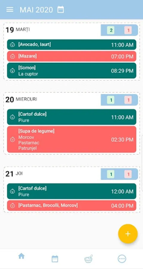 Is it hard to remember all the foods you already offered to your baby and which you didn't? "Diversificare" helps you! We keep all these details in an easy and organized way. You can always see a summary of the meals. We already have a predefined list of foods for you. If you can't find a food, you can easily add any ingredient you want.