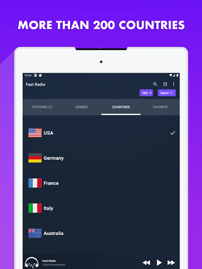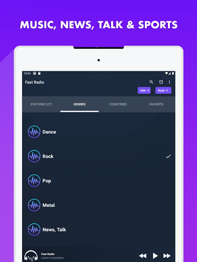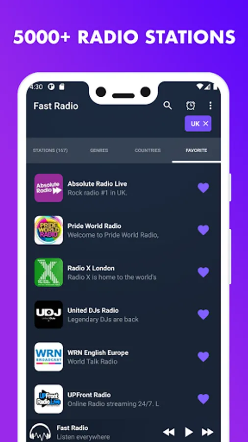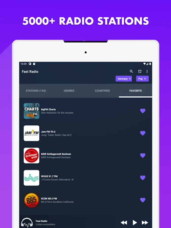 With FastRadio app you can listen to live radio streaming from all over the world on your android phone or tablet. With a modern and easy to use interface, app gives you the best experience when it comes to listening to online radio, internet radio, AM and FM radio.