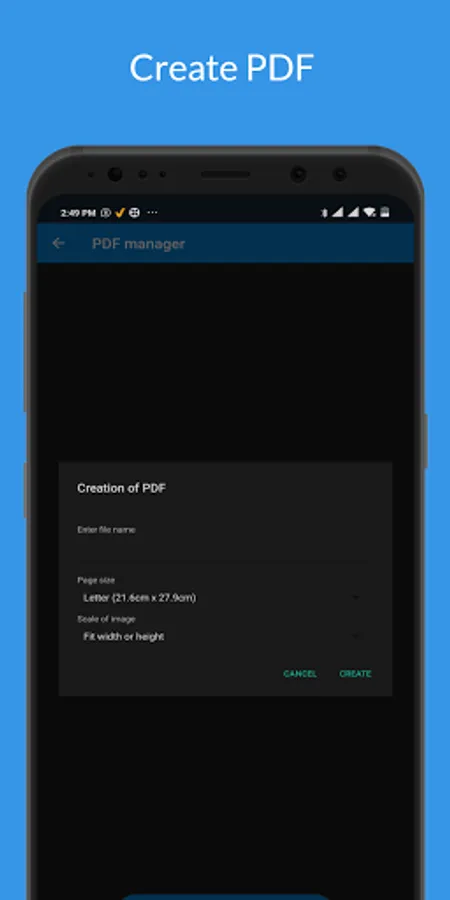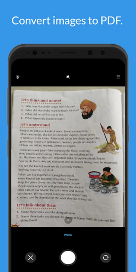 It allows users to 'scan' documents by taking a photo with the device's camera and convert the photo as PDF.