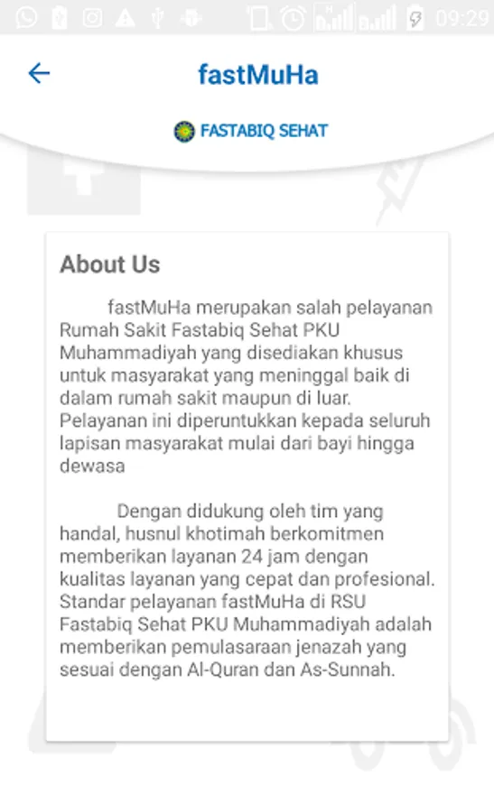 fastMuHa is one of the services of PKU Muhammadiyah's Fastabiq Healthy Hospital that is provided specifically for people who die both inside and outside the hospital. This service is intended for all levels of society ranging from infants to adults.