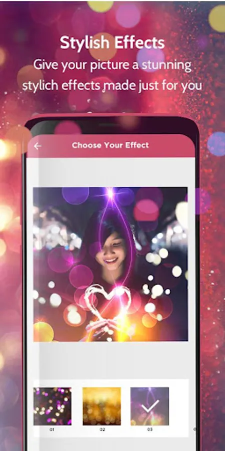 Sincerely this powerful photo editor accumulated a lot of overlay effects such as : Glitter , Magic light, Galaxy , Bokeh , Neon light , and you will also try light overlay effect and surely you will be eligible to switch your pictures into a new level !