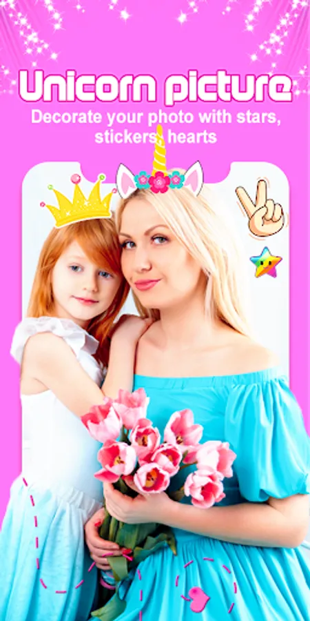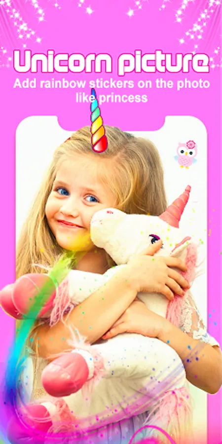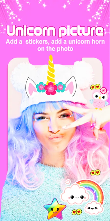 Did you ever think of adding the horn of a pony unicorn to your ordinary photos? This facility is now available for free in unicorn pic photo editor. Our ultimate comprehensive app contains a wide range of unicorn effects such as pony unicorn, unicorn princess, rainbow unicorn and pink unicorn. It hosts one of the prettiest hair accessories to match perfectly with the unicorn effect. However, unicorn pic photo editor has also an artistic collection of stickers more like kawaii stickers, cartoon stickers, motion stickers and pigeon stickers as well as food stickers. Along with a magical bunch of frames for the sake of decorating your photos on the most professional and ideal way of photo editing.
