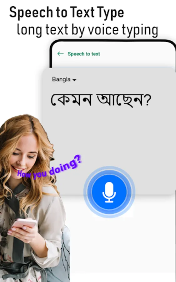 Do you find it difficult to type Bangla words in your smart mobile keyboard? Then Bangla keyboard with Text to speech Translator will help you to write in roman English as it is English to Bangla keyboard so it will convert that roman English in your language automatically, now anyone can write even though they don’t know how type. So, this Bangla Voice To text Converter is Easy to use for anyone.