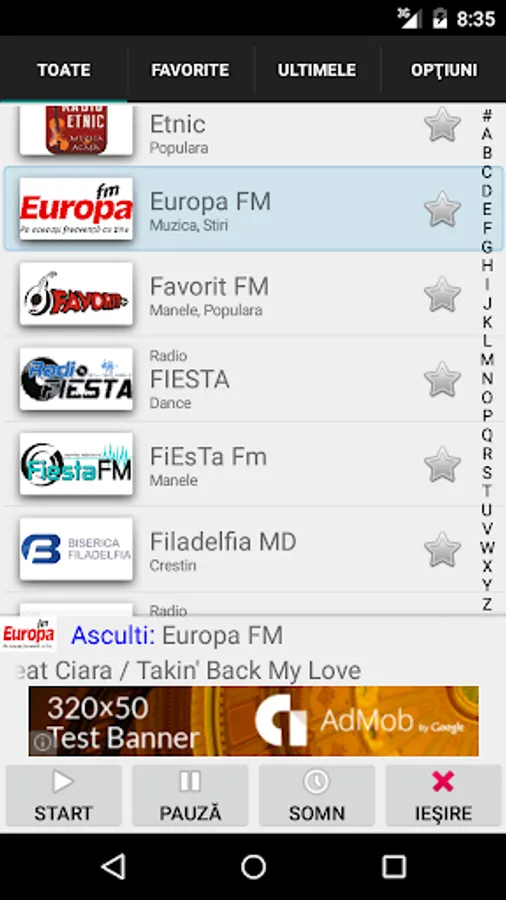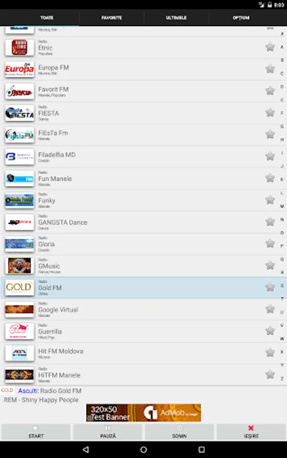 the list of radios from which the desired station can be selected. The list is sorted alphabetically, and the user has an index, to find the post easier;
