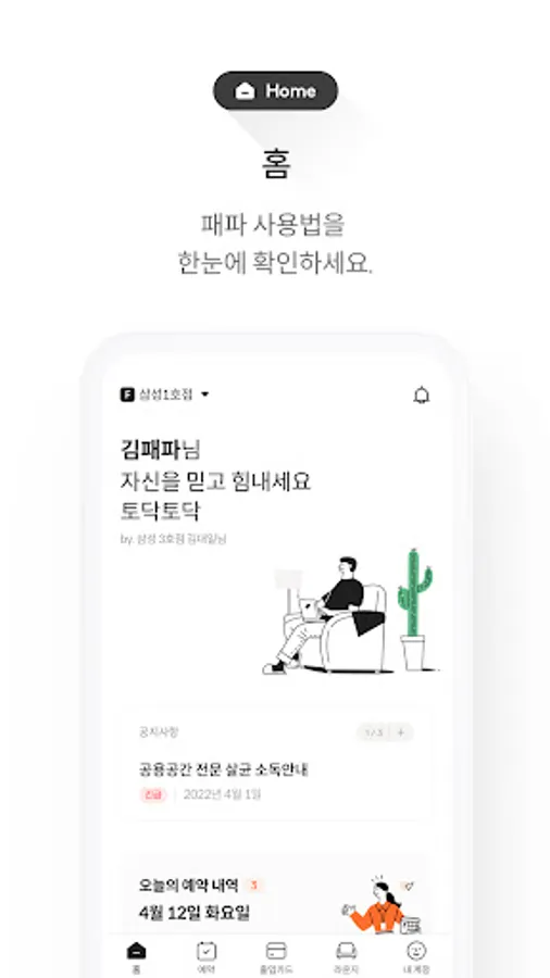 Take a look at the branch information you are using through the app. We will inform you of everything you need to use the space, such as branch notices and parking information. Receive inquiries quickly through 1:1 inquiry.