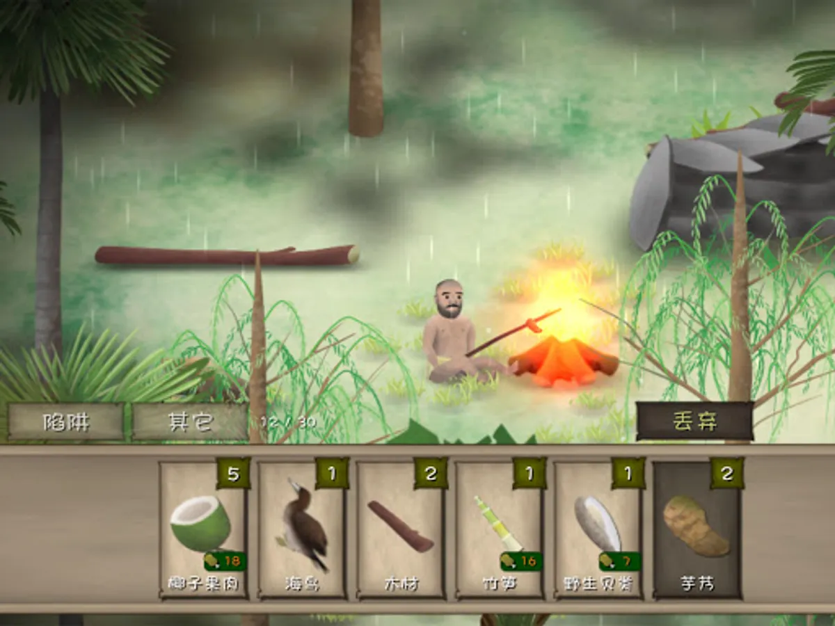 The area is very large in each scene.You can set up a camp and make a campfire anywhere.You can put traps where you think it is easy to catch animals. When raining,you can use containers to hold water.When you can see nothing in the dark night,you can use torch to help you.