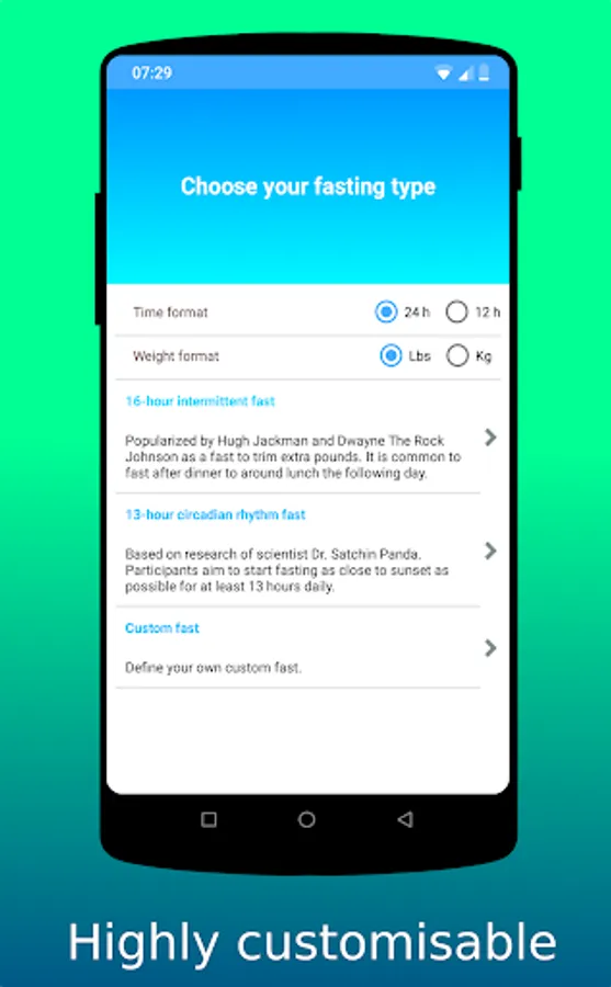 Fasti allows users to select 3 types of fasting, 16 hour fast, 13 hour fast or create a custom fasting time. It even allow to set LONGER fasts (72 hours max).