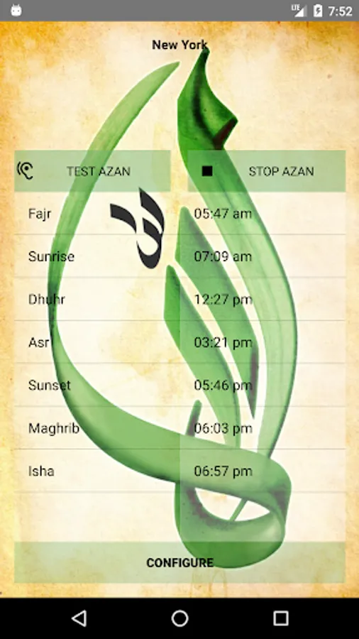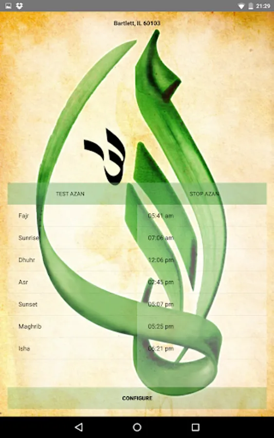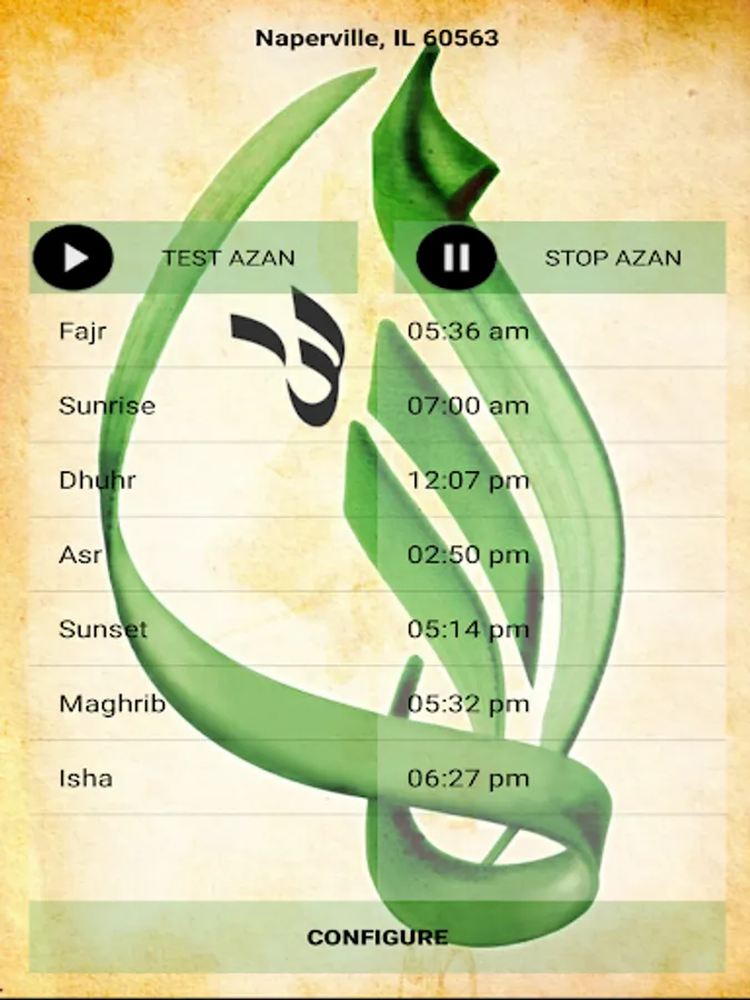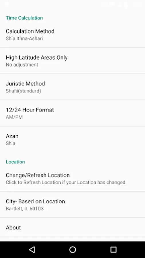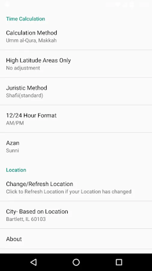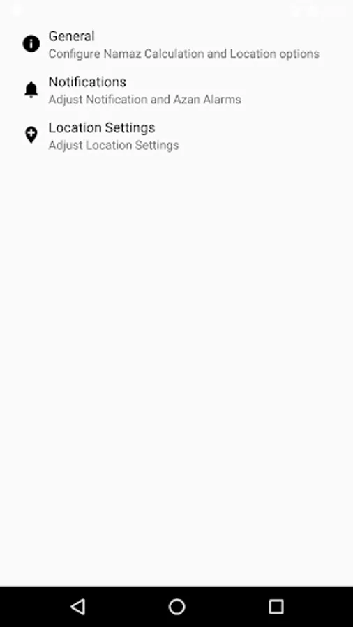 - On first use , navigate to Settings to set prayer time calculation method, Azan and notifications.