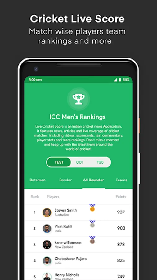 In this app we have also provided the all format International rankings of the players & teams. You can check various rankings format wise and style wise too.