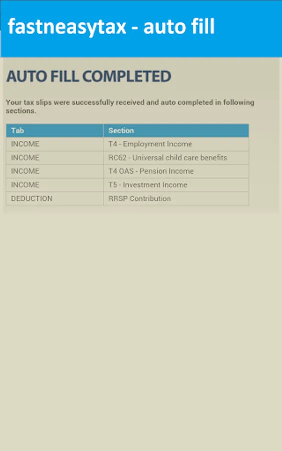 Canadian tax return filing got easier and faster with CRA Auto-fill My Return – Connect to CRA My account service through the fastneasytax app, download your available tax information for the current year and update your tax slip info in all the right places with just one click.
