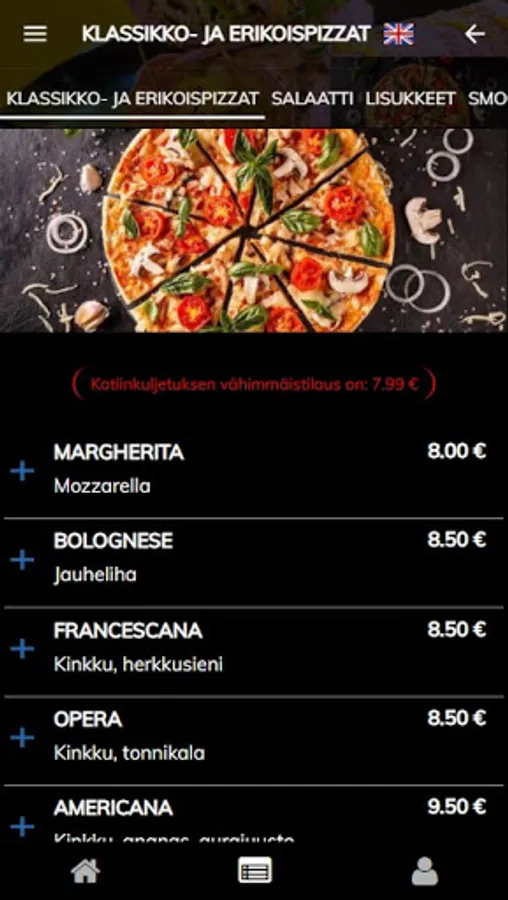 pizzat suoraan listasta, erilaiset valkosipulileivät tai extratäytteet ja annoksen kylkeen valittava juoma – tai