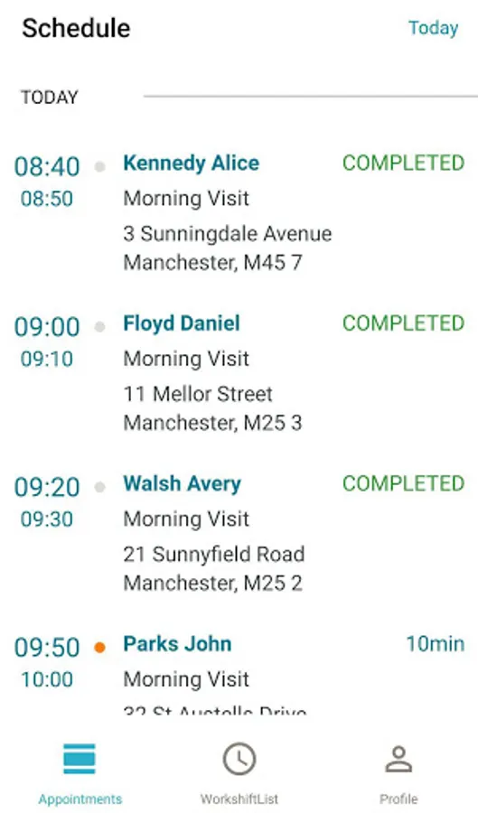 Employees can record the start and end times of an appointment. Customer NFC tags can be read to verify the duration of an appointment. Employees can record notes related to the appointment or a specific task and highlight notes as important so they can be flagged and escalated. In the case of an appointment cancellation, or a task deviation, a reason has to be recorded as to why this has occurred and this also generates an alert. Updates on the employee's programme of work, including appointment information during the work day, are available via the RTC App.
