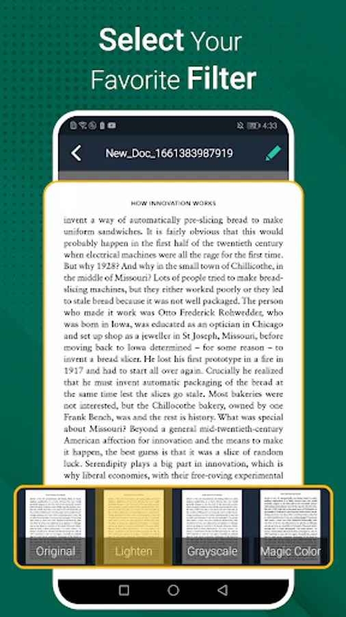 Its precise border detecting, smart cropping, and auto enhancing features ensure the PDF outputs clear, sharp, and high-resolution. Multiple filter options are also provided to further optimize the scan results - photo, documents, clear, color, black & white.