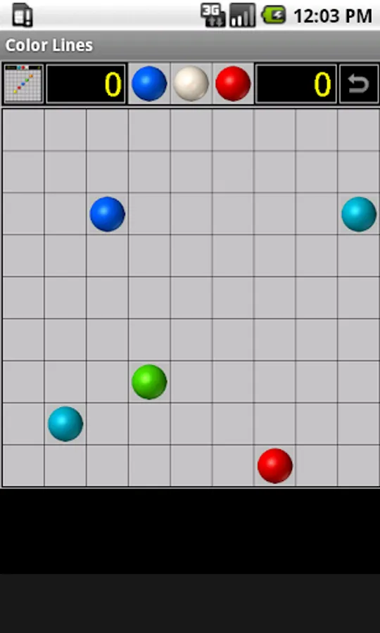 It is classic Color Lines. The game starts with a 9×9 board with three balls chosen out of seven different colours. If the player does form such lines of at least five balls of the same colour, the balls in those lines disappear, and he gains one turn, i.e. he can move another ball. If not, three new balls are added, and the game continues until the board is full.