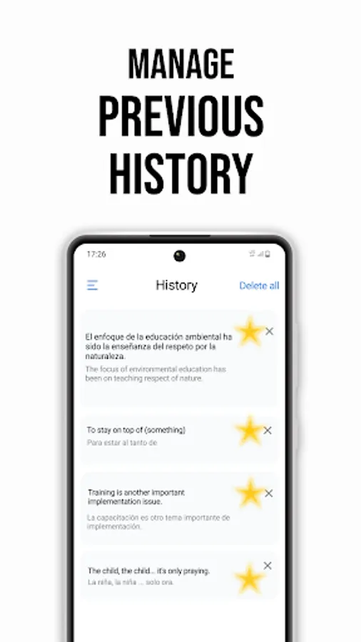 The Translate now app provides detailed history for your translations. You can pin and save your most frequent translations for later.