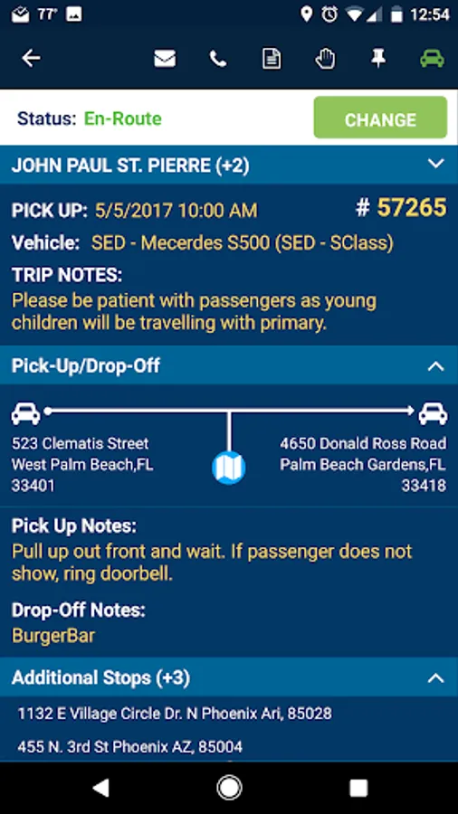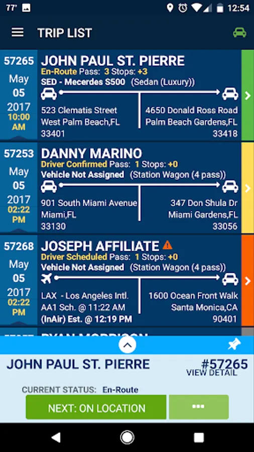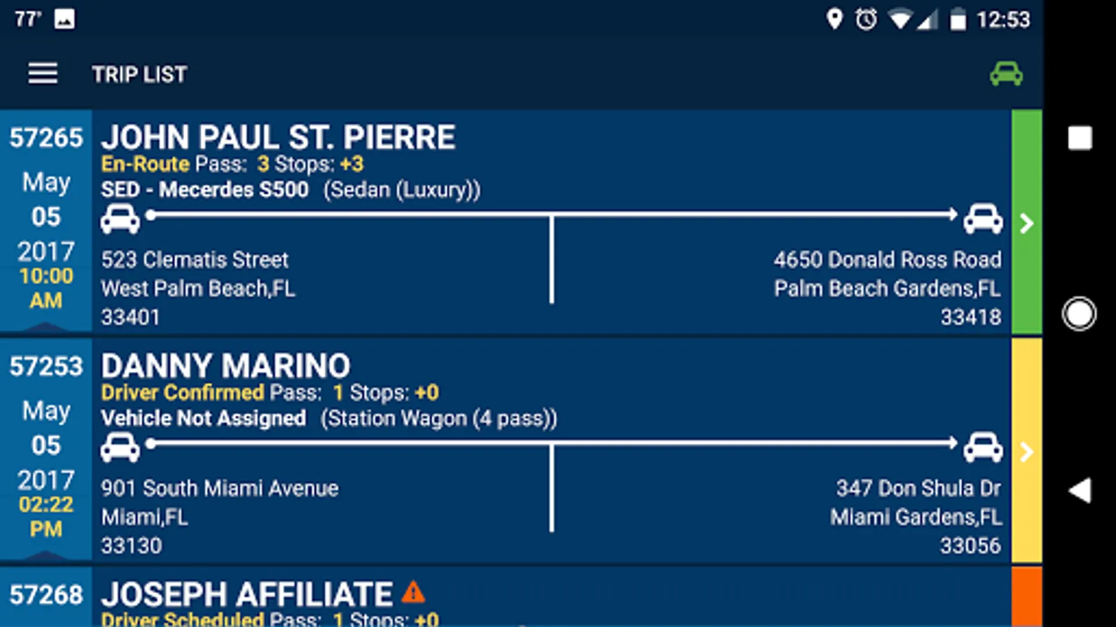 Once a driver begins trip (En Route Status), the driver and trip will become "Active", capturing driver status and location for use within the dispatch software. The driver will have the ability to set the appropriate trip status throughout the trip, including On Location, On Board and Dropped. Drivers will also have the ability to set exception statuses including No Show.