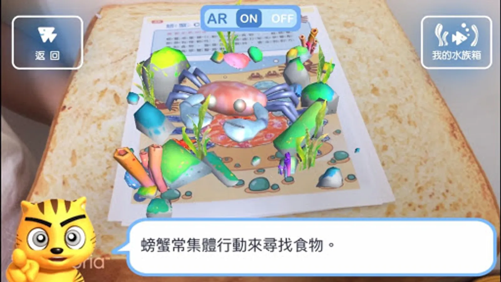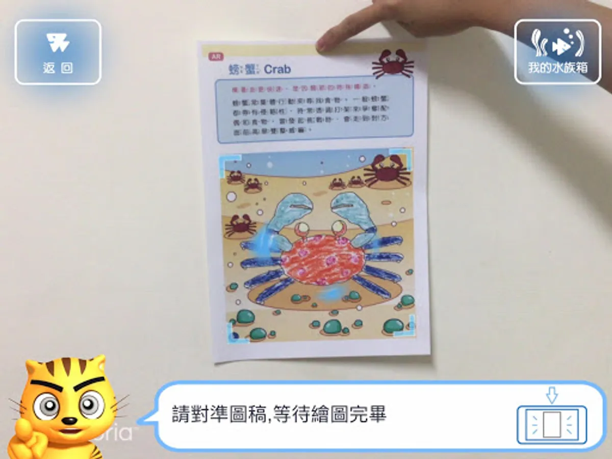 口 本APP程式配合我的創意水族箱著色圖書,能讓每一個著色後的海洋生物主角在手機、平板實境畫面中以3D仿真動態呈現。著色本書中每一隻海洋生物主角對應生物百科知識深入淺出,活潑生動的專業配音在趣味中的認識每一隻海洋生物。