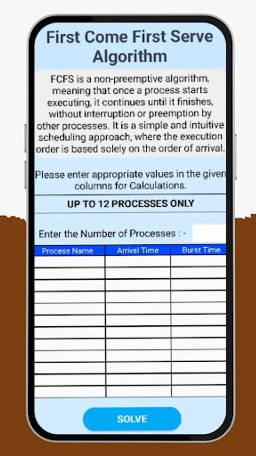 1. First-Come, First-Served (FCFS): Evaluate the performance of the FCFS algorithm by entering the arrival time and burst time for each process. The app will generate the waiting time, turnaround time, and Gantt chart, providing a clear visualisation of the scheduling sequence.